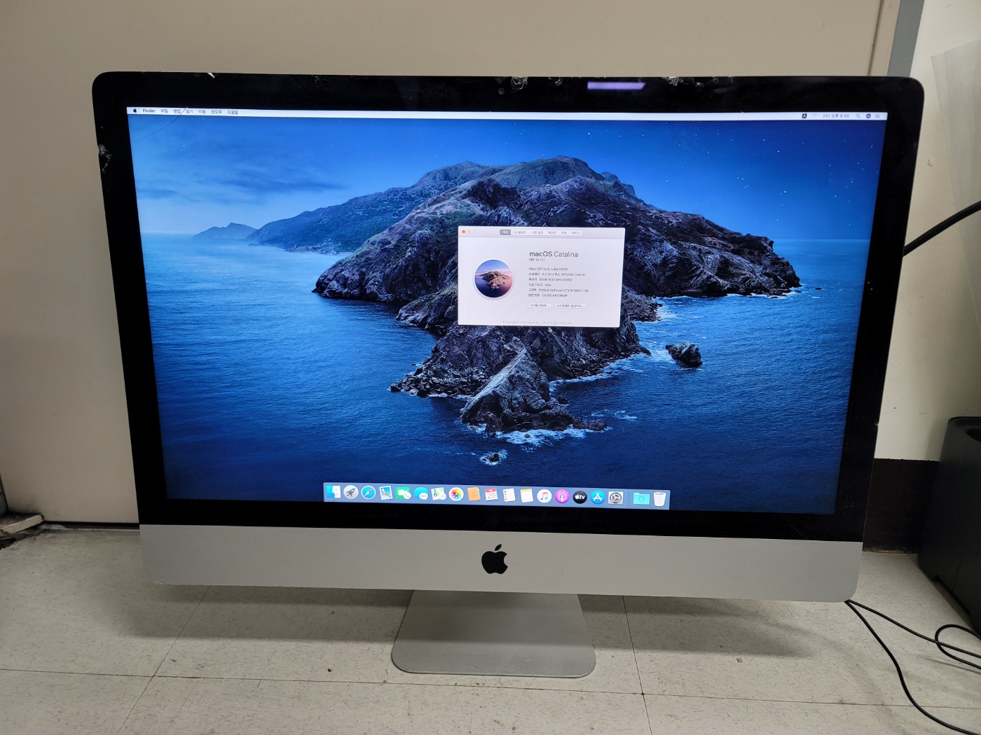 화면 강화유리 파손 있습니다. 전면 유리 파손이라서 사진처럼 화면 출력에는 문제 없구요. 뒷면에 테이프 흔적이 있는데 제거 가능합니다. 아이맥 단품에 전원케이블(일반,검정) 포함 입니다.
